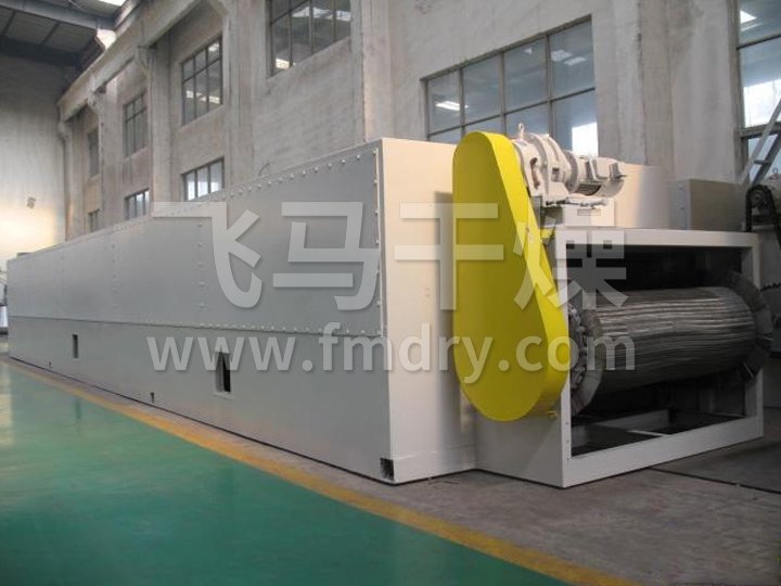 整個生產線(xiàn)為全封閉型(對(duì)物料而言),由擺動(dòng)布料段、幹燥段、出料段三部分組成。擺動(dòng)布料段作用使海藻均勻分散在網板上,並且勻(yún)速輸送到幹燥段,海藻經過80℃熱風幹燥段,90℃熱風幹燥段和120℃熱風幹燥(zào)段後,再經(jīng)過出料段排料(liào)。循環風向及(jí)各單元內風的循環為向下式,即加熱後的空(kōng)氣(qì)由引風機(jī)吸入,在風(fēng)機出風口首先預分布再經過孔板均風後,熱風從物料的下麵向(xiàng)上(或從物料的上麵向下)穿透物料層。